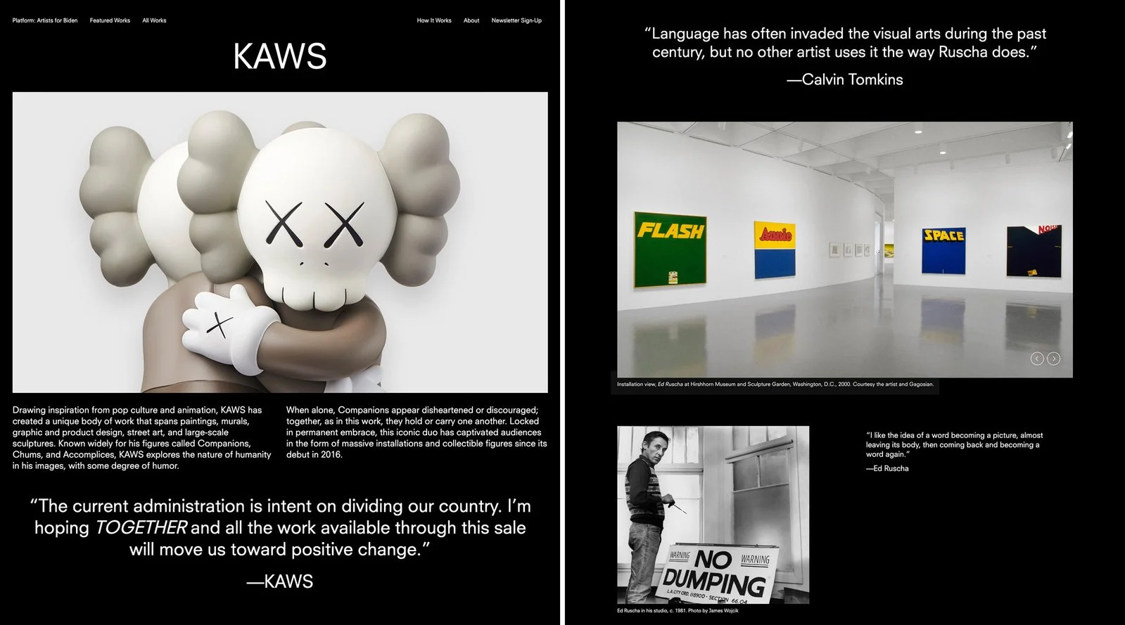 Figure 4. “Featured Works” pages for KAWS’ 'TOGETHER' (2017), left, and Ed Ruscha’s 'We (#1)' (2020), right. Artists for Biden, accessed September 2020.