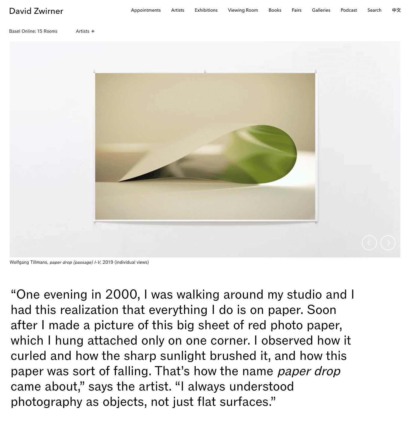 Figure 1. Artwork page for Wolfgang Tillmans' 'paper drop (passage) I-V' (2019), accessed June 17, 2020.
