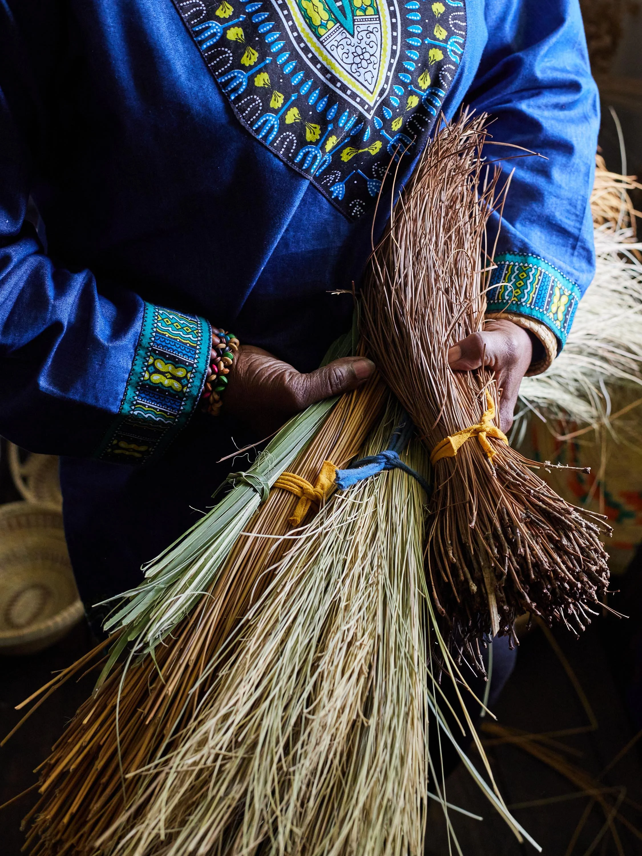 Figure 12. Gullah artist Nakia Wigfall holding basket weaving material in her Mt. Pleasant, South Carolina home. Photo by Peter Frank Edwards.