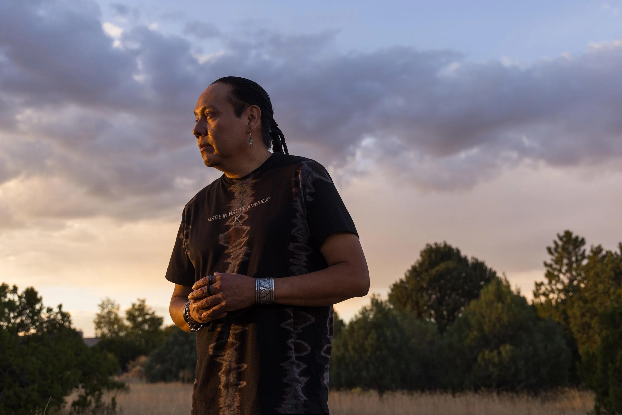 Figure 63. Artist Virgil Ortiz outside of an art collector’s home in Santa Fe, New Mexico. Photo by Minesh Bacrania.